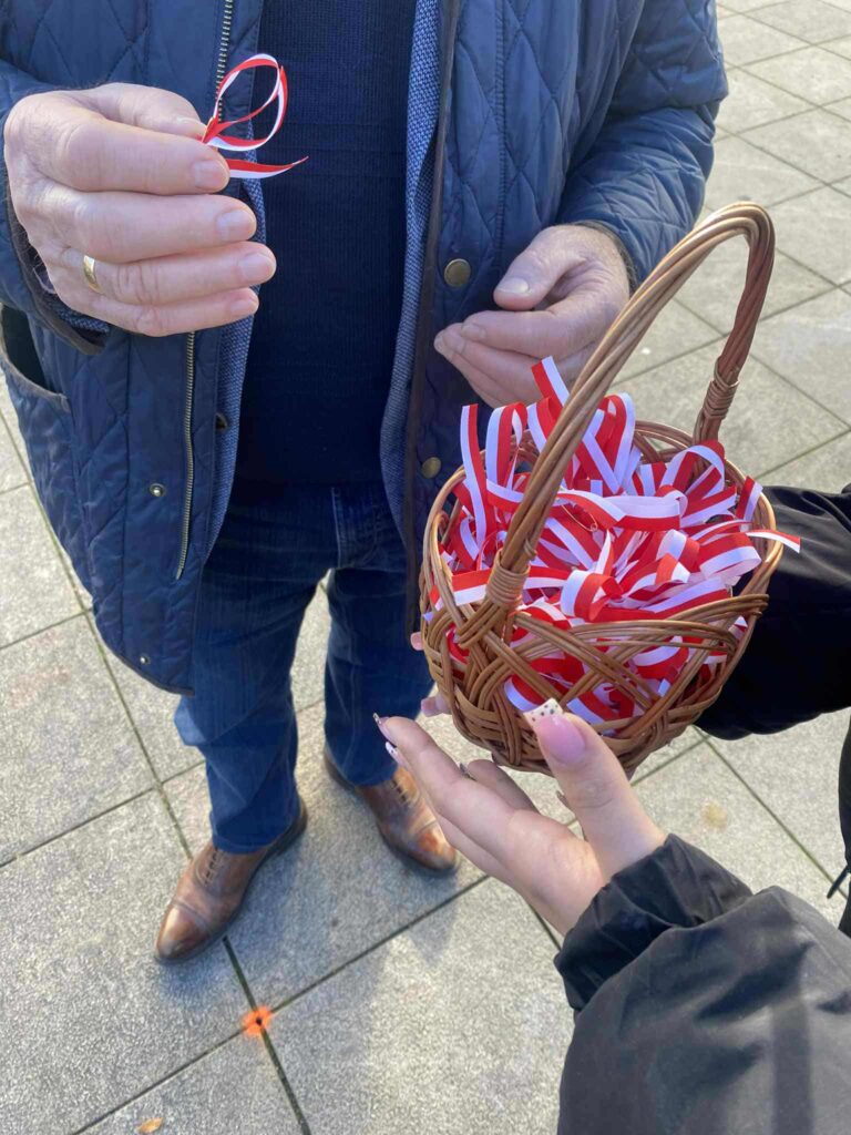 Uczniowie z VII LO z dumą rozdają własnoręcznie wykonane kotyliony, by mieszkańcy miasta mogli celebrować Narodowe Święto Niepodległości z patriotycznym symbolem.