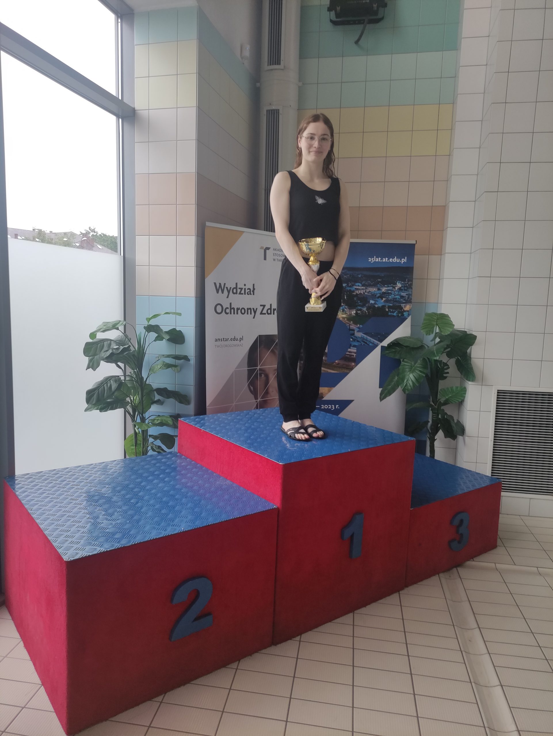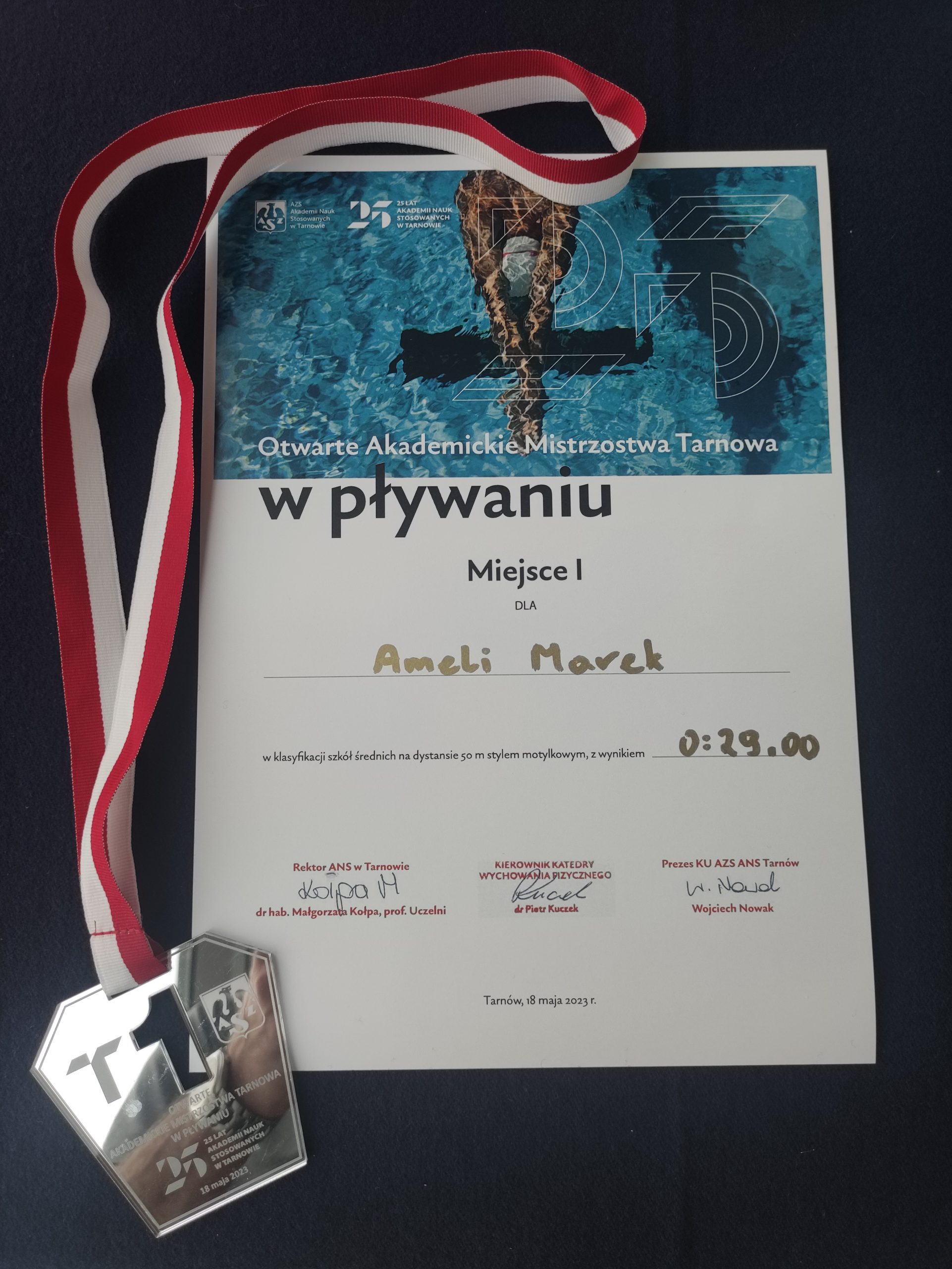 18 maja 2023 r. odbyły się Otwarte Akademickie Mistrzostwa Tarnowa w pływaniu z okazji 25 – lecia Akademii Nauk Stosowanych w Tarnowie. Naszą szkołę reprezentowała uczennica klasy 3D Amelia Marek. Startowała w dwóch konkurencjach: na dystansie 50 m stylem klasycznym i 50 m stylem motylkowym. W obu startach zajęła I miejsce – na 50 m stylem klasycznym z czasem – 0:33,42, a na 50 m stylem motylkowym – 0:29,00. Amelia została ponadto wybrana najlepszą zawodniczką Otwartych Akademickich Mistrzostw Tarnowa w pływaniu w kategorii szkół średnich.