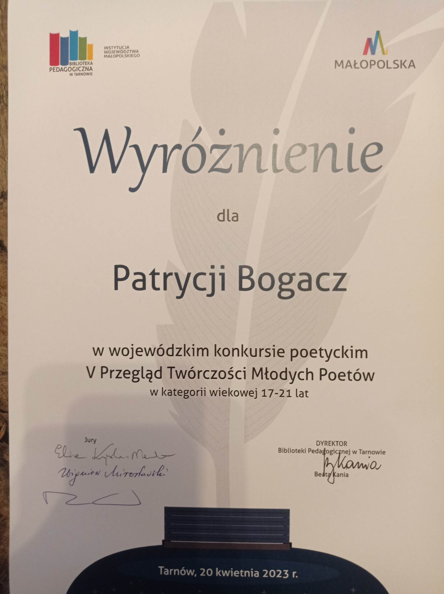 Uczennica naszej szkoły, Patrycja Bogacz, otrzymała wyróżnienie